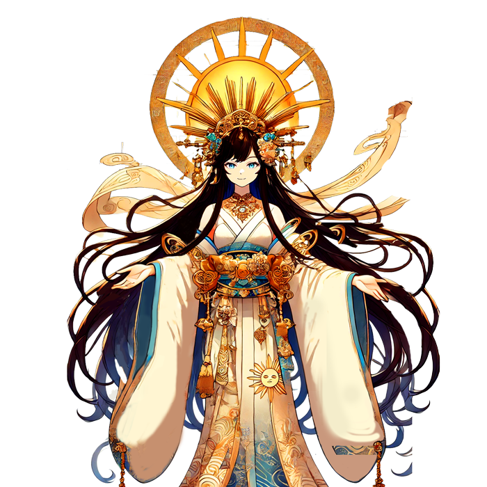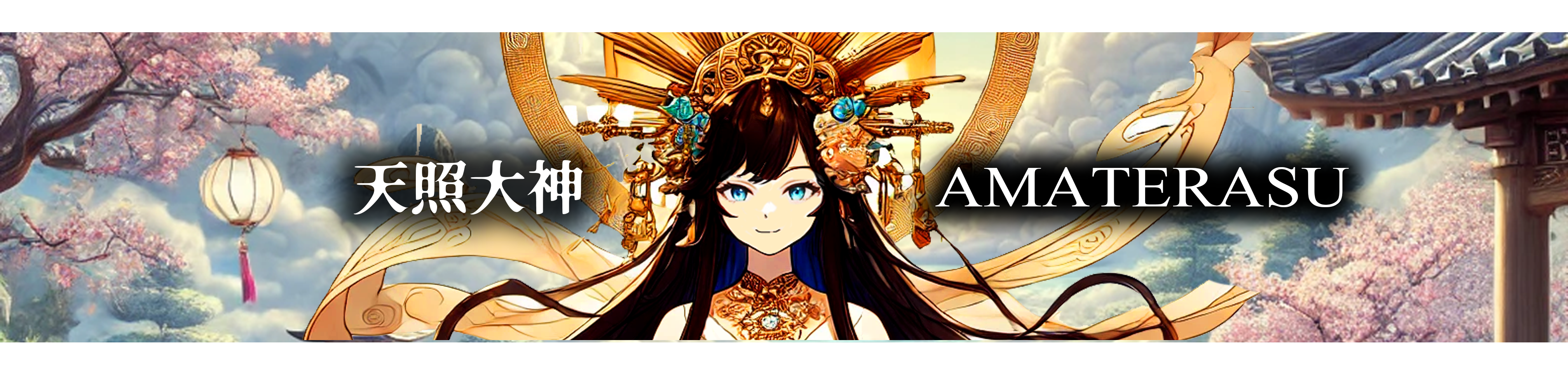 三貴神(アマテラス・ツクヨミ・スサノオ)の長姉で太陽神。高天原(神様の世界)にてスサノオの乱暴狼藉を嘆き、天岩戸に隠れたことも。